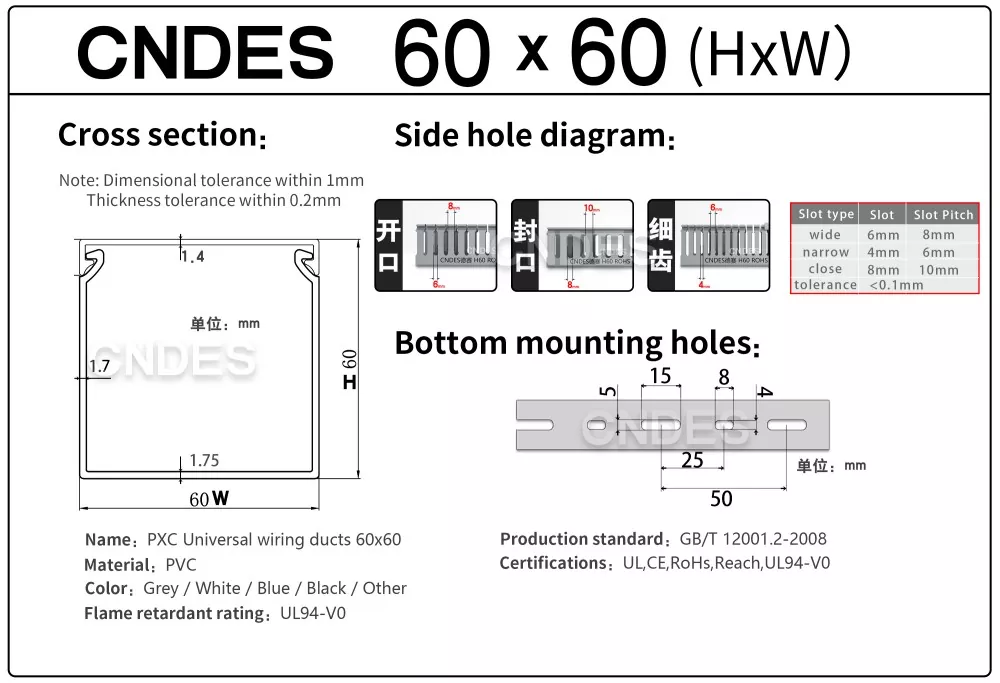 CNDES басқару шкафының кабель арнасы меншікті ПВХ формуласынан жасалған. Саңылаулы ПВХ басқару шкафының арнасы экологиялық таза, отқа төзімді және соққыға төзімді және үзілмей 180° қайталанатын иілуге төтеп бере алады.