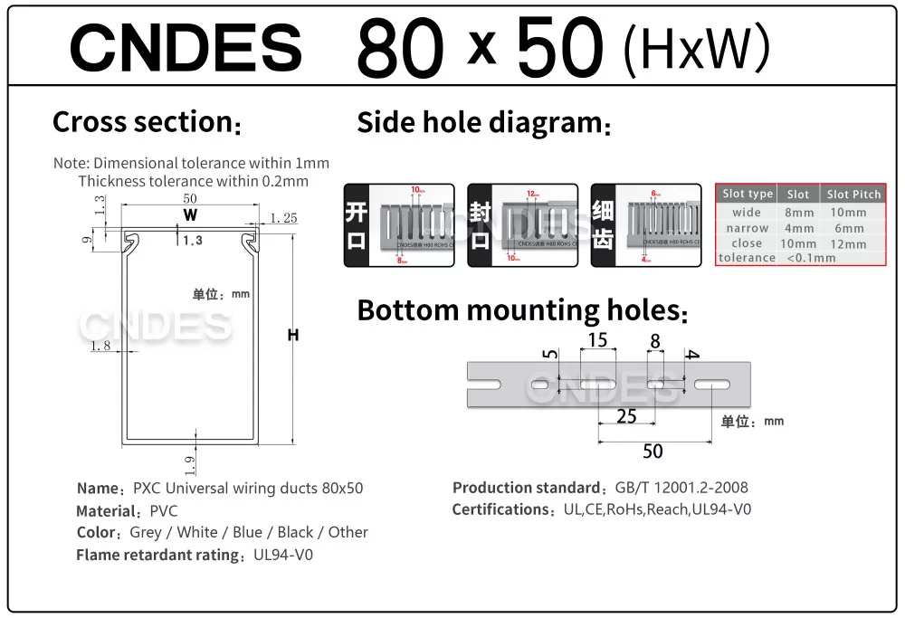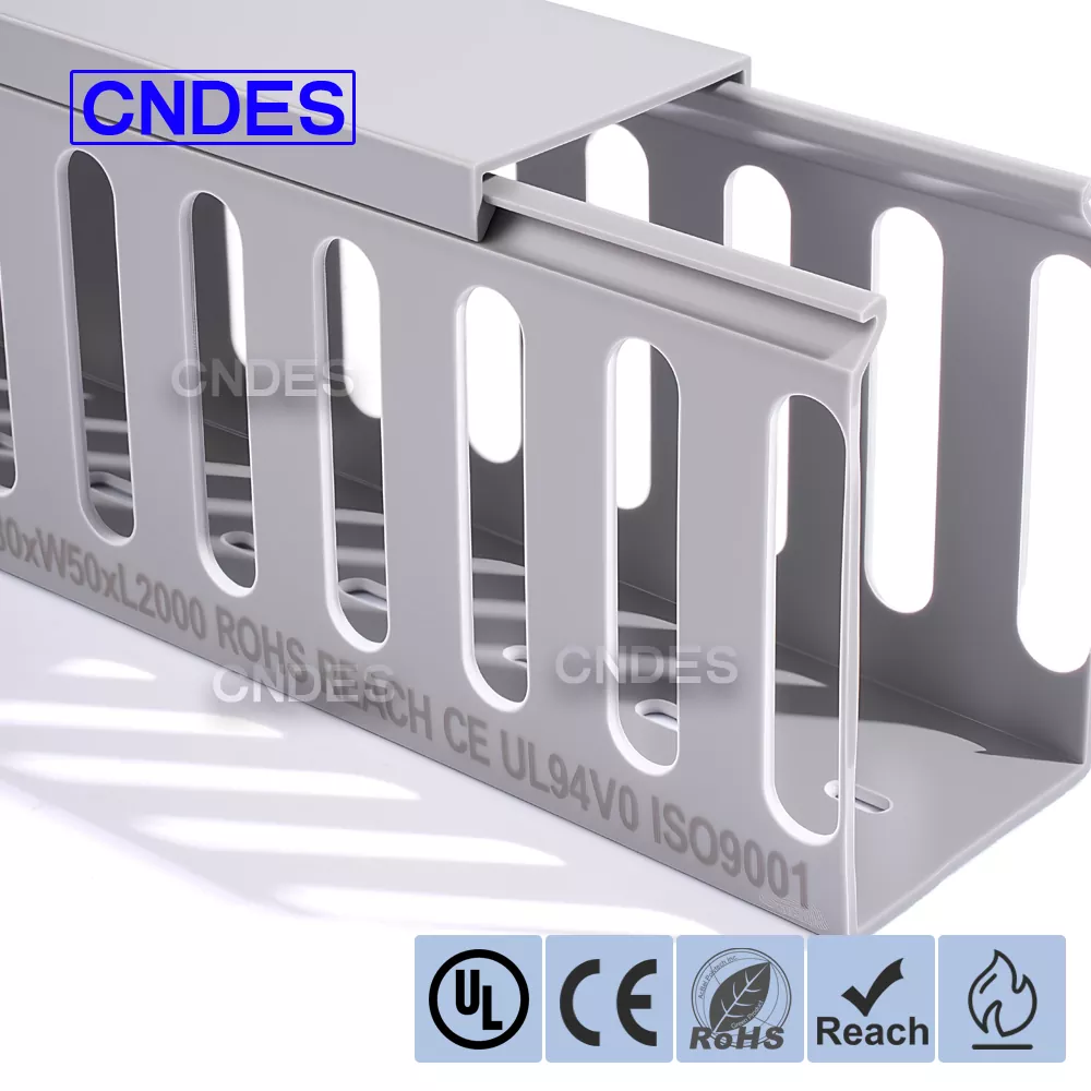 CNDES - Қытайда орналасқан ПВХ саңылаулары бар кабельдік науалардың кәсіби өндірушісі. Мұнда біз 80*50 мм биіктігі 80 мм және ені 50 мм кабельдік науаны білдіретін 80 × 50 саңылаулары бар ПВХ панельді кабель организаторын таныстырамыз.