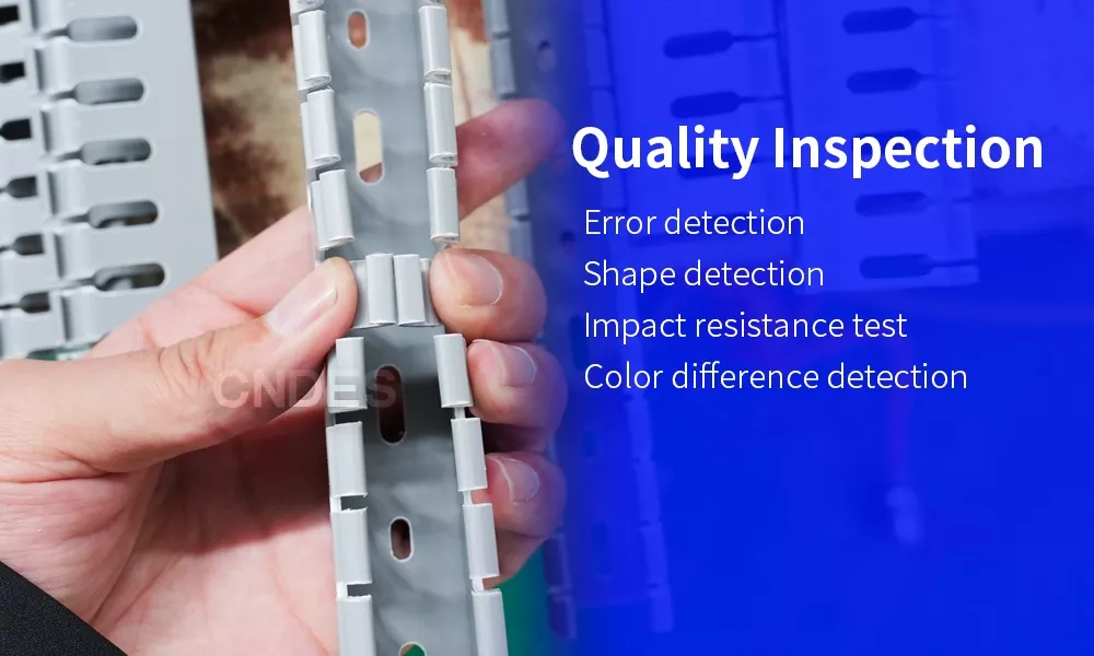 Жақсы өнімді қамтамасыз ету үшін жоғары стандартты сапаны тексеру маңызды. CNDES-те біздің сапаға ұмтылуымыз шексіз. Біз өз клиенттерімізді сенімді өнімдермен қамтамасыз ету үшін бар күш-жігерімізді аямаймыз. Бізде өнімдерді онлайн-тексеру үшін ауысыммен жұмыс істейтін төрт сапа инспекторы бар. Бұл біздің Сапалы 80 биіктіктегі саңылаулары бар ПВХ автоматтандыру кабельдік каналдарының пішіні төртбұрышты, тегіс беттері бар, рұқсат етілген беріктік стандарттарына сәйкес келеді,